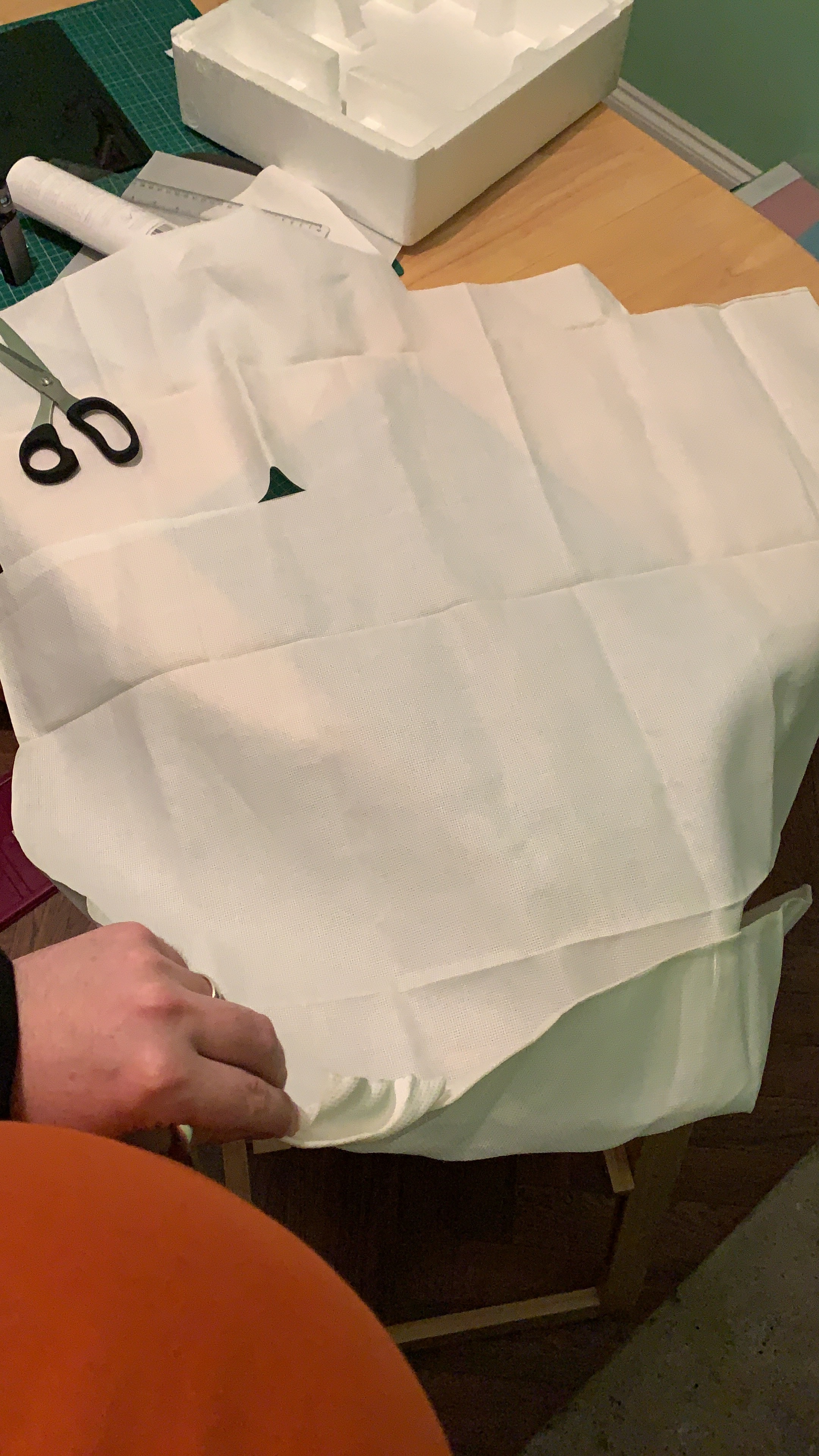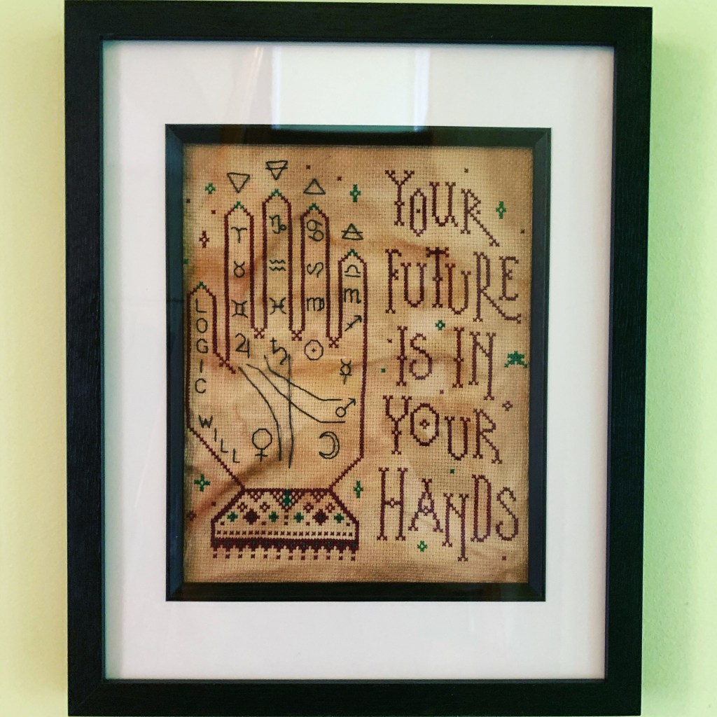 I may have mentioned my little crafting friend before @hev77 well she mentioned doing a project at the same time and went for the Palmistry pattern by The Witchy Stitcher which I love so couldnβt say no. Only problem was I didnβt have coloured Aida to do it on so decided to dye my own with tea and then baking it…